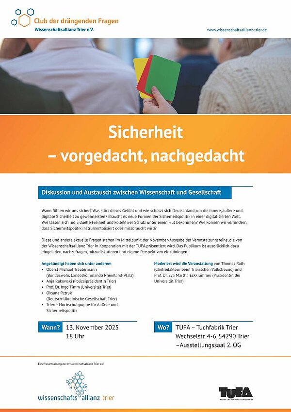 Die Veranstaltungen werden in Kooperation mit der TUFA - Tuchfarbrik Trier präsentiert und von Thomas Roth (Trierer Volksfreund) und Universitätspräsidentin Prof. Dr. Eva Martha Eckkrammer moderiert.